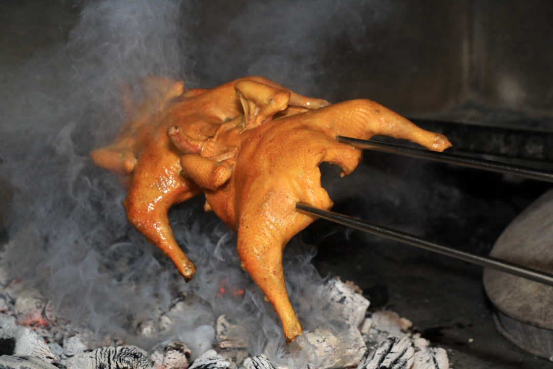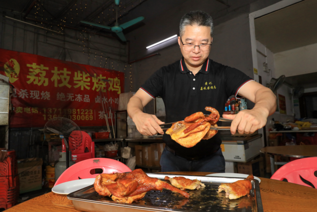 烧好的鸡刚从炭火上取下,那股混合着荔枝木清香的肉香就飘满整家店。